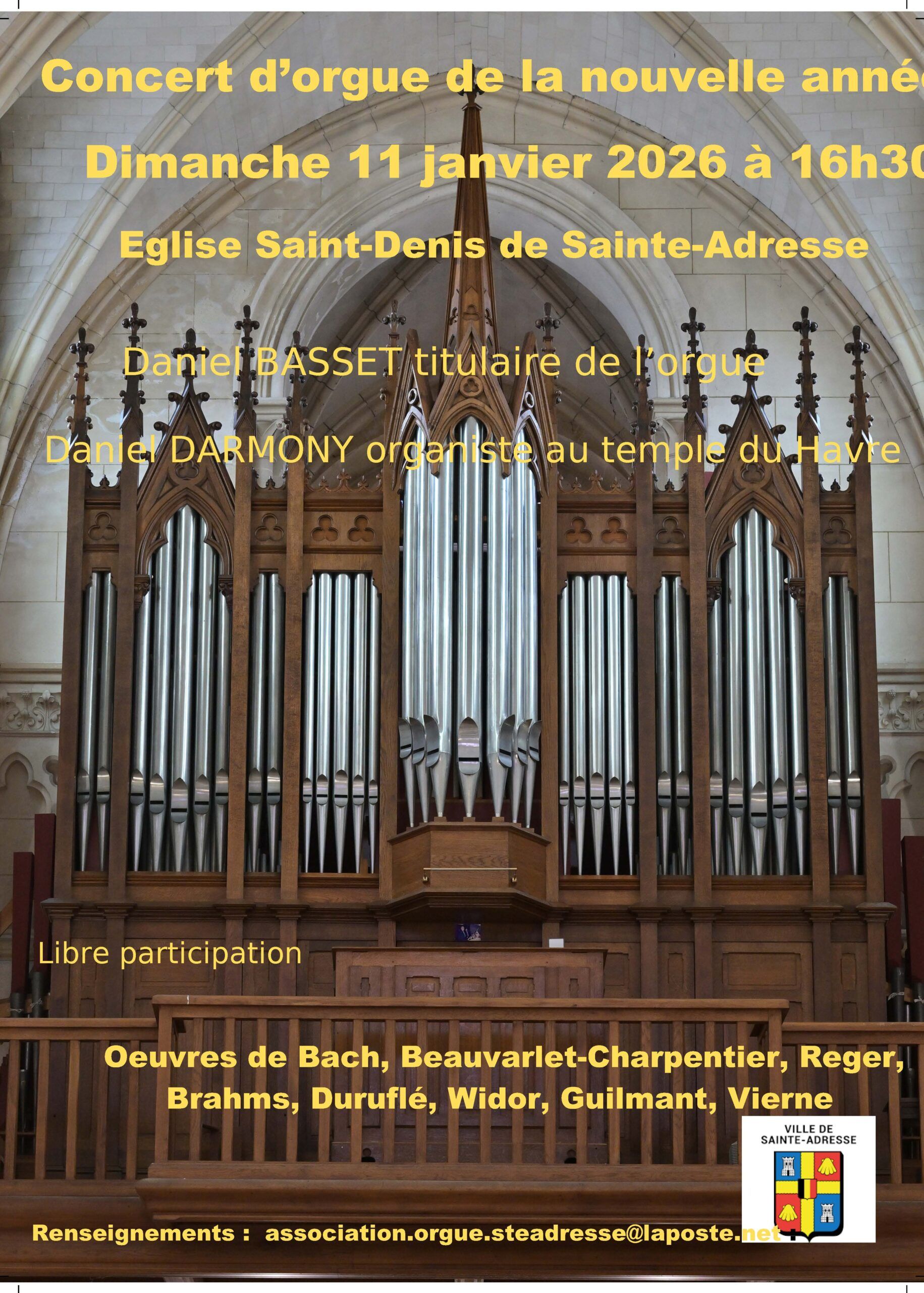 L’Association Les Amis de l’Orgue de Saint-Denis de Sainte-Adresse organise un concert d’orgue pour la nouvelle année à l’Église Saint-Denis de Sainte-Adresse, par Daniel Basset et Daniel Darmony.