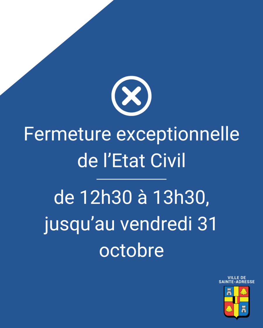 L’État civil sera exceptionnellement fermé de 12h30 à 13h30, du jeudi 23 octobre au vendredi 31 octobre 2025. Nous vous remercions de votre compréhension.